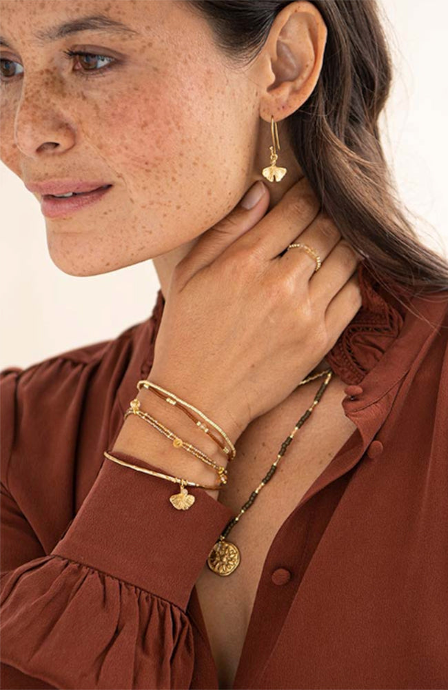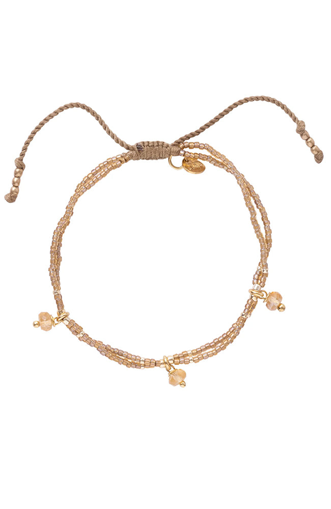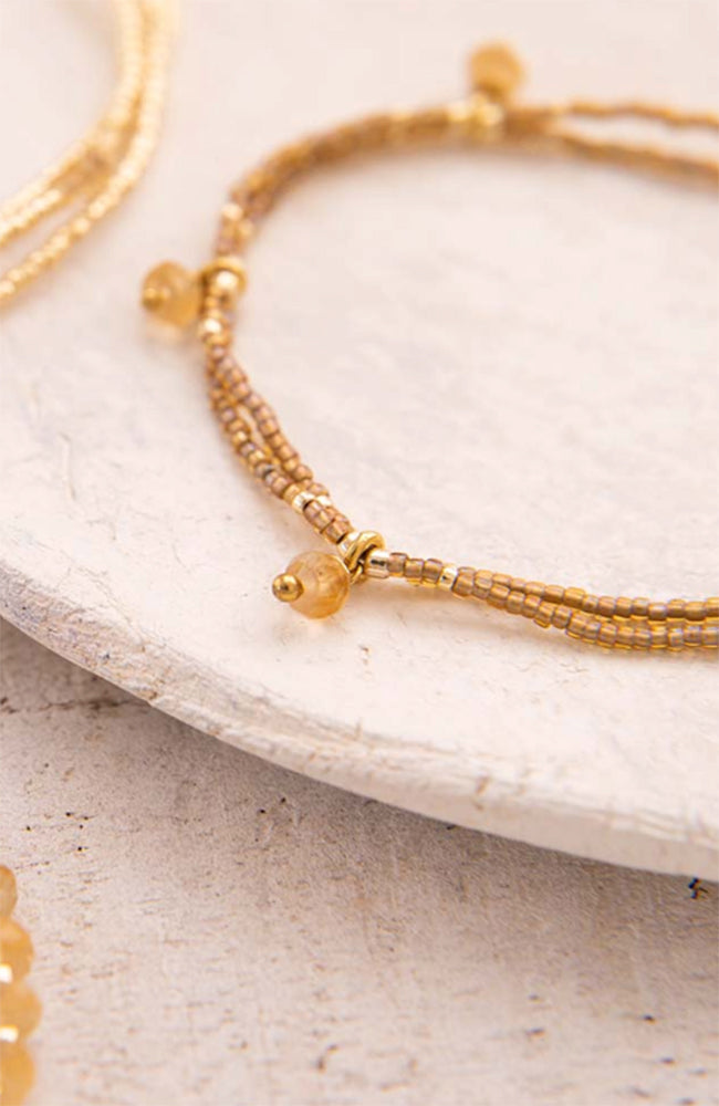 Twee armbandjes (16-22 cm) van A Beautiful Story die bestaan uit een combinatie van glaskralen, messing kralen en kleine labradoriet edelsteentjes, geregen op draad. De armband heeft een schuifslot van katoendraad. De citrine edelsteen staat voor helderheid, vrolijkheid, optimisme.