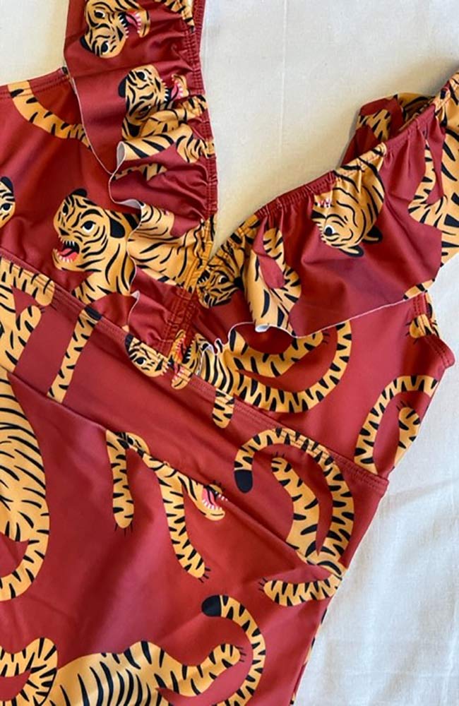 Dit badpak Andra van AAVA is stoer en elegant te gelijk. Het heeft een bruinrode ondergrond met getekende tijgers er op. Het model heeft een V-hals met ruches, welke doorlopen over de rug in een diepe V. De flatterende tailleband accentueert je middel. De (verwijderbare) padded cups zorgen voor stevig support, ook bij een grote cupmaat. Het badpak is gemaakt van duurzaam ECONYL en is volledig gevoerd. Het ademt, zit comfortabel en is super zacht en stretchy.
