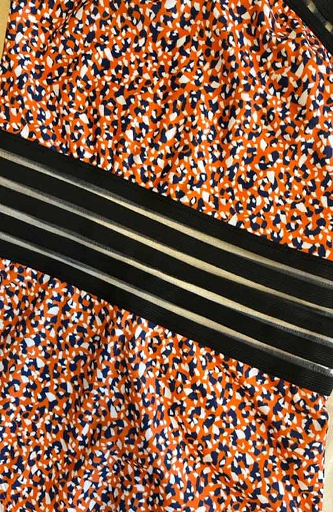 Dit prachtige Faye badpak van AAVA heeft een oranje, blauw en witte animal confetti print. Het heeft twee gekruiste doorzichtig/zwarte banden aan de voorkant die over de rug recht naar beneden lopen. Eenzelfde band legt het accent op de taille. Het badpak is zo ontwikkeld dat de elastische band en de gekruiste schouderbanden i.c.m. het stevige materiaal genoeg ondersteuning geven aan de buste (er zitten geen cups in dit badpak), ook voor grote borsten tot en met cup G. Het badpak is gemaakt van duurzaam ECONYL. Het ademt, zit comfortabel en is super zacht en stretchy.