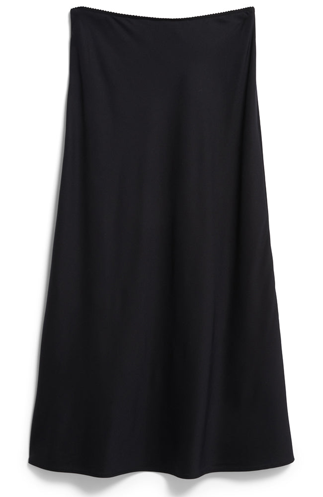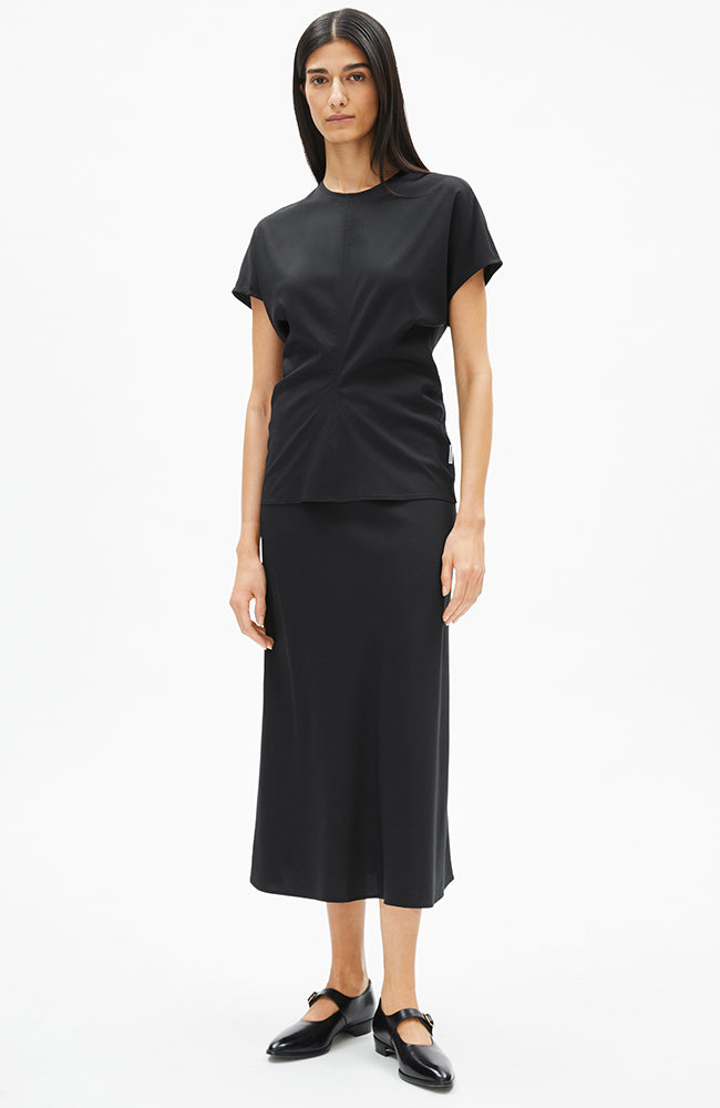 Leuke zwarte midi rok van ARMEDANGELS in zwart. Ze heeft een regular fit en een mid waist hoogte. Ze heeft een elastieken band en valt golvend naar beneden voor die extra vrouwelijke touch. Draag haar met de feestelijke Ainimialaa top in zwart, ook van ARMEDANGELS.