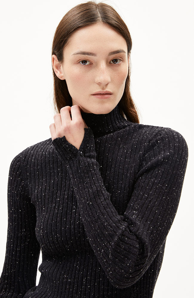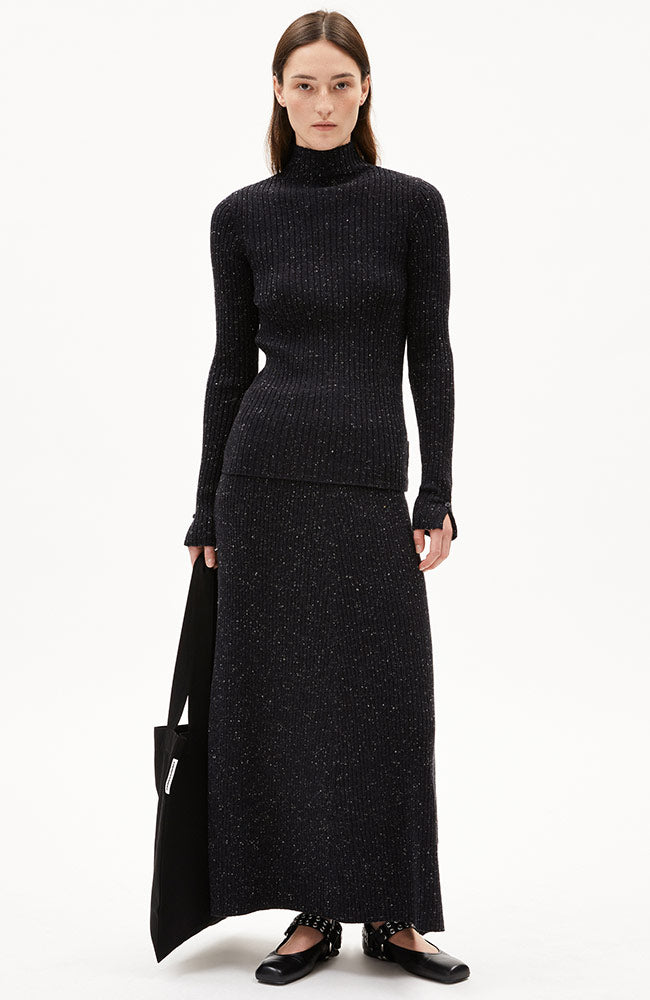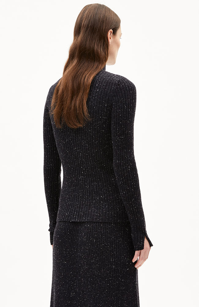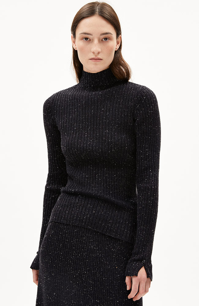 Nieuw dit seizoen is de Alaania 'tweed' van ARMEDANGELS! Ze is namelijk gemaakt van een mix van zacht biologisch katoen én gerecyclede wol. Verder heeft dit welbekende model van de Alaania ook een geschubde lage col, verticale rib en een aangesloten fit.