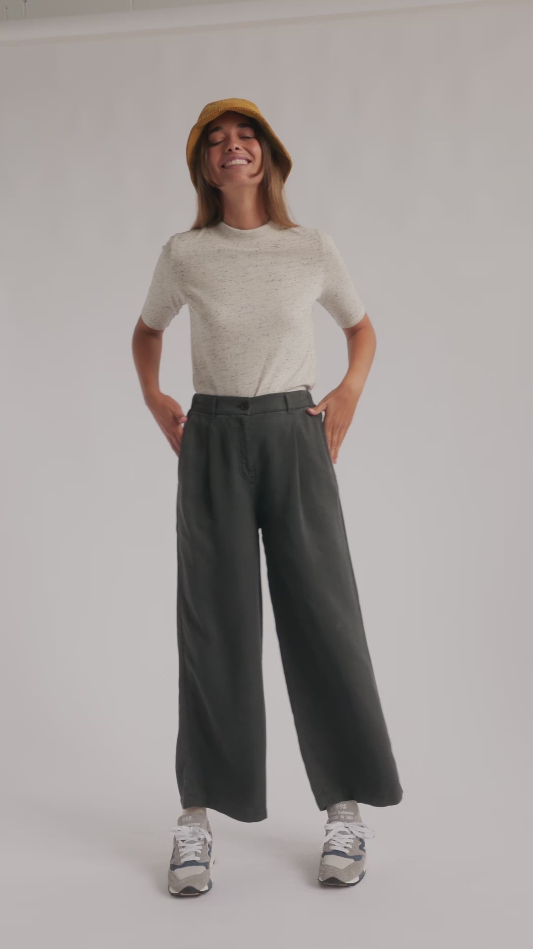 Mooie pantalon van het Spaanse merk TWOTHIRDS in een lichtgrijze kleur. Het betreft een high waist model tot net boven de enkel (cropped), ze heeft een wijde fit, bandplooien aan de voorkant en de soepele stof is 100% Lyocell TENCEL. De elastische band sluit met een Corozo (steennoot) knoopje.