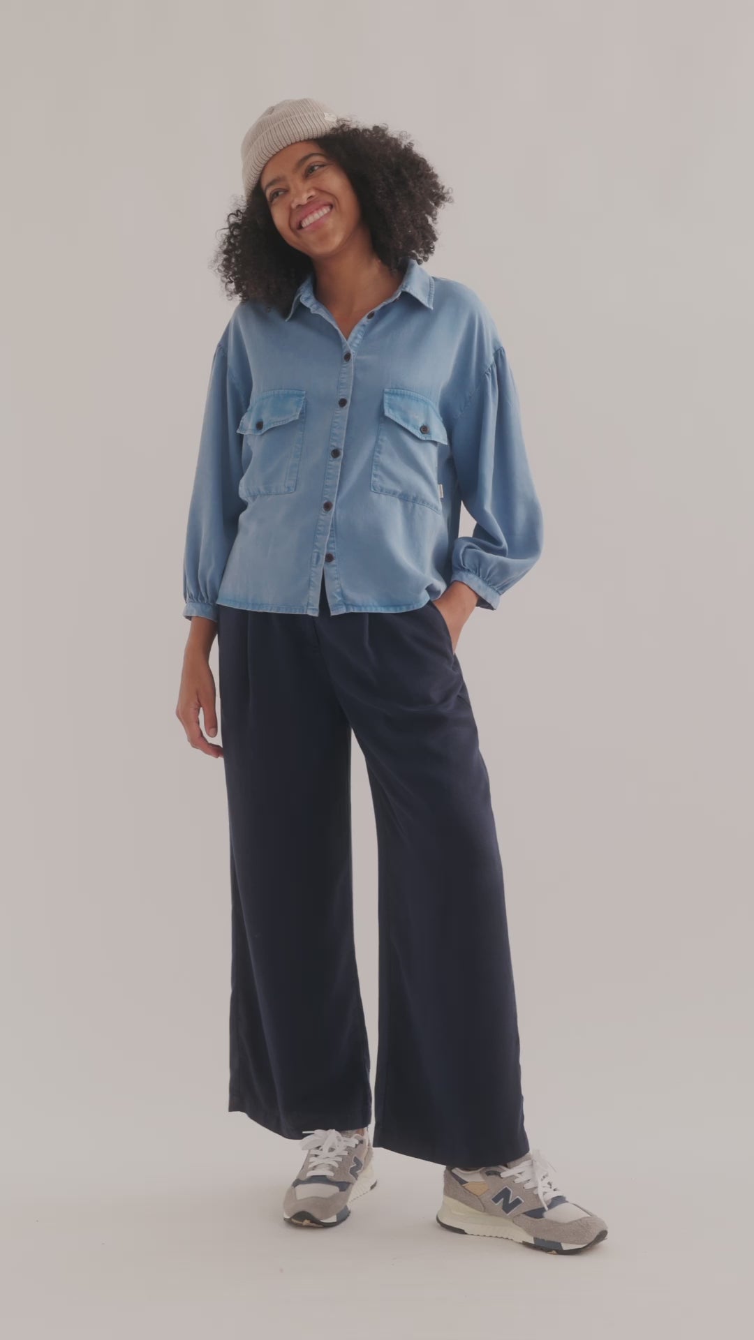 Prachtige, kwalitatieve blouse van het Spaanse merk TWOTHIRDS in een mooie blauwe kleur: 'washed blue'. Het elegante model heeft een relaxed fit, pofmouwtjes tot net over de elleboog, 2 borstzakjes en leuke bruine knoopjes (Corozo). Ze valt soepel langs het lichaam en is licht van gewicht door het natuurlijke Lyocell TENCEL materiaal. Het model op de foto is 1.73m lang en draagt maat S.