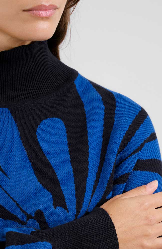 Mooie jaquard gebreide winterjurk van Dedicated gemaakt van zacht en duurzaam biologisch katoen. De jurk heeft een mooi zwart met blauw patroon van een bloem. Ze heeft een wijde fit, geribde kleine col en lange mouwen met geribde, elastische manchetten. Gemaakt van katoen dus 100% zonder kriebel.