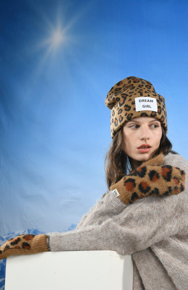 Leuke muts met luipaard print van het merk VERB TO DO lichtbruin met de tekst 'Dream Girl'. Ze is gemaakt met gerecyclede materialen (Repreve).