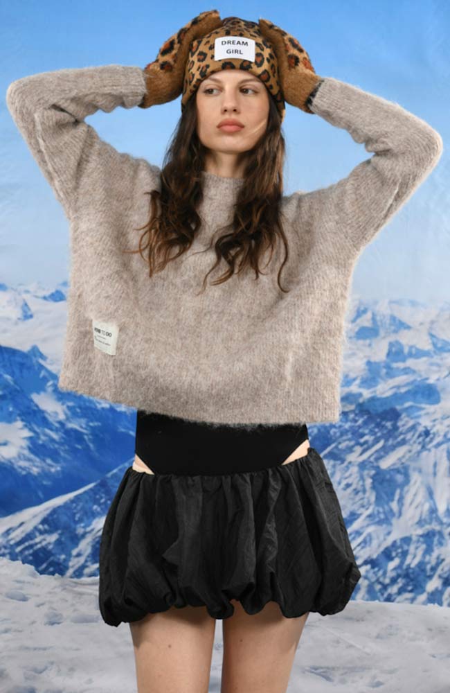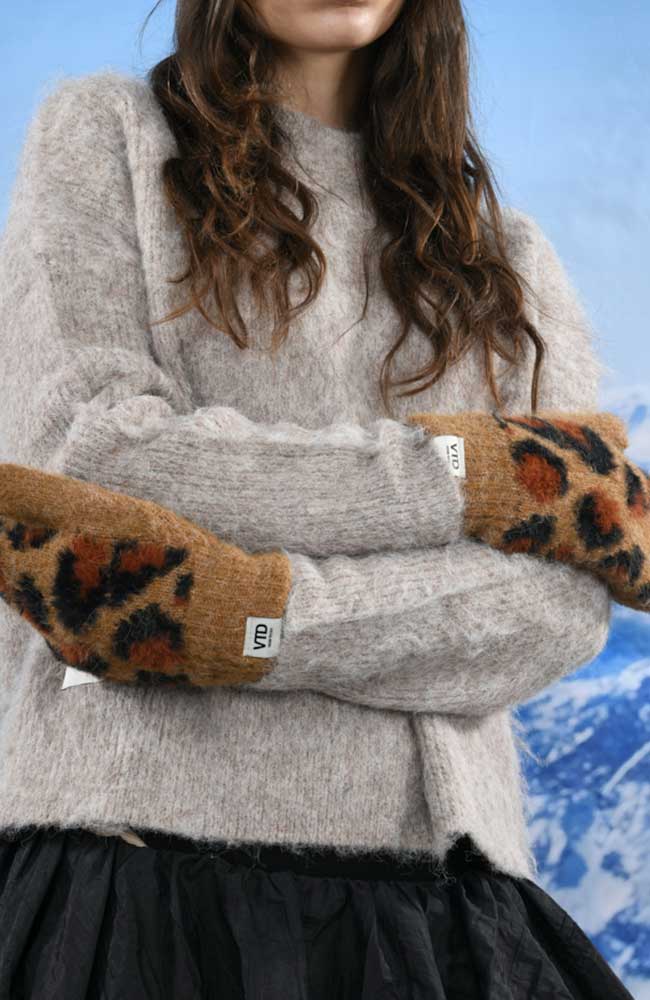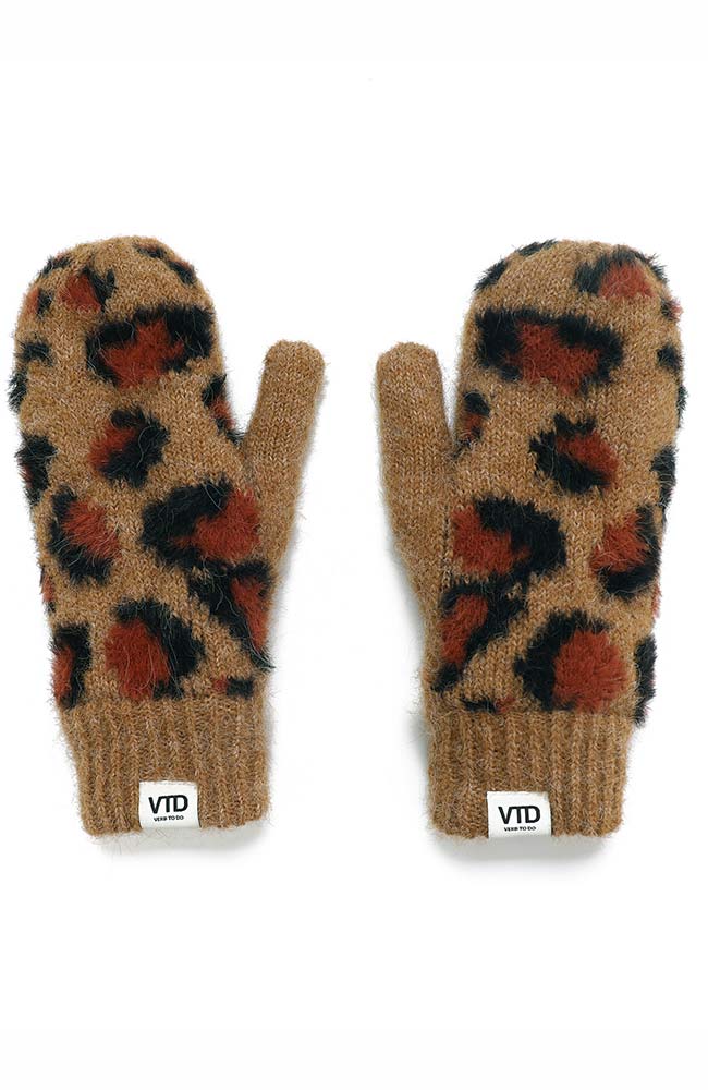 Leuke wanten met luipaard print van VERB TO DO lichtbruin met zwart en rode luipaardvlekken. Ze zijn gemaakt van o.a. wol en gerecycled polyester.
