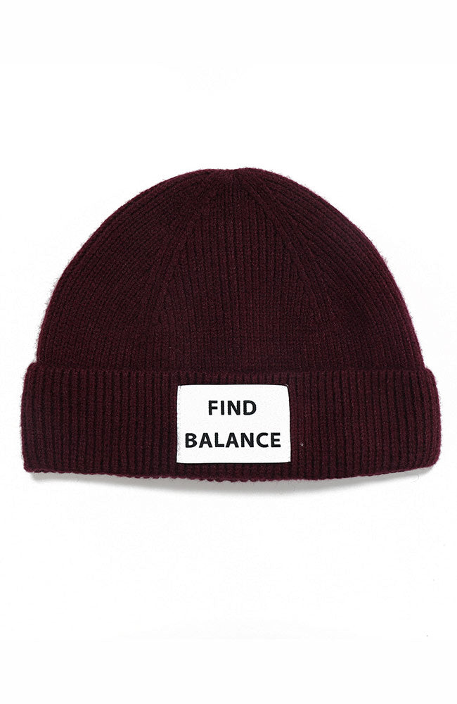 Leuke muts van het merk VERB TO DO in bordeaux rood met de tekst 'Find balance'. Ze is gemaakt met gerecyclede materialen (Repreve).