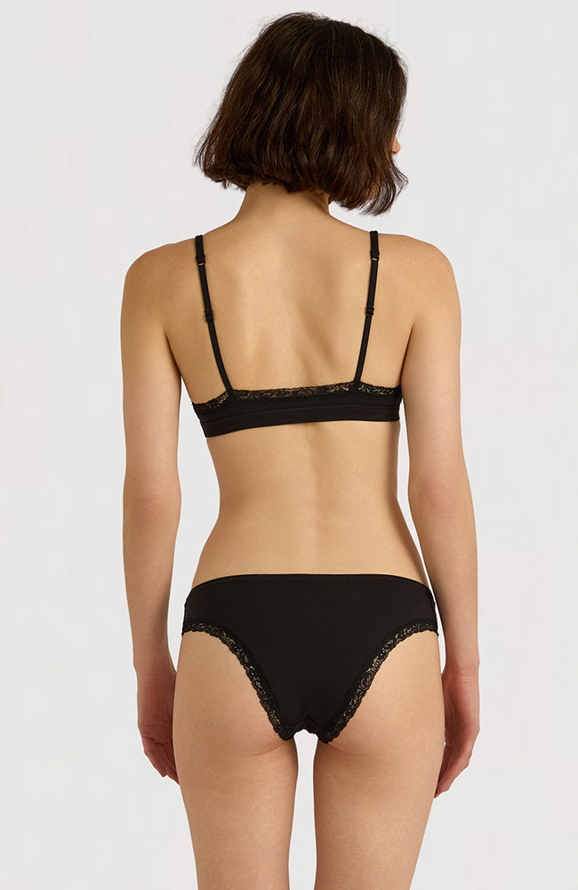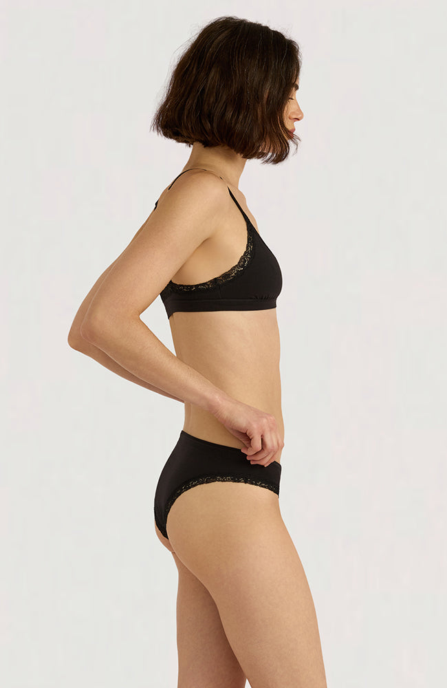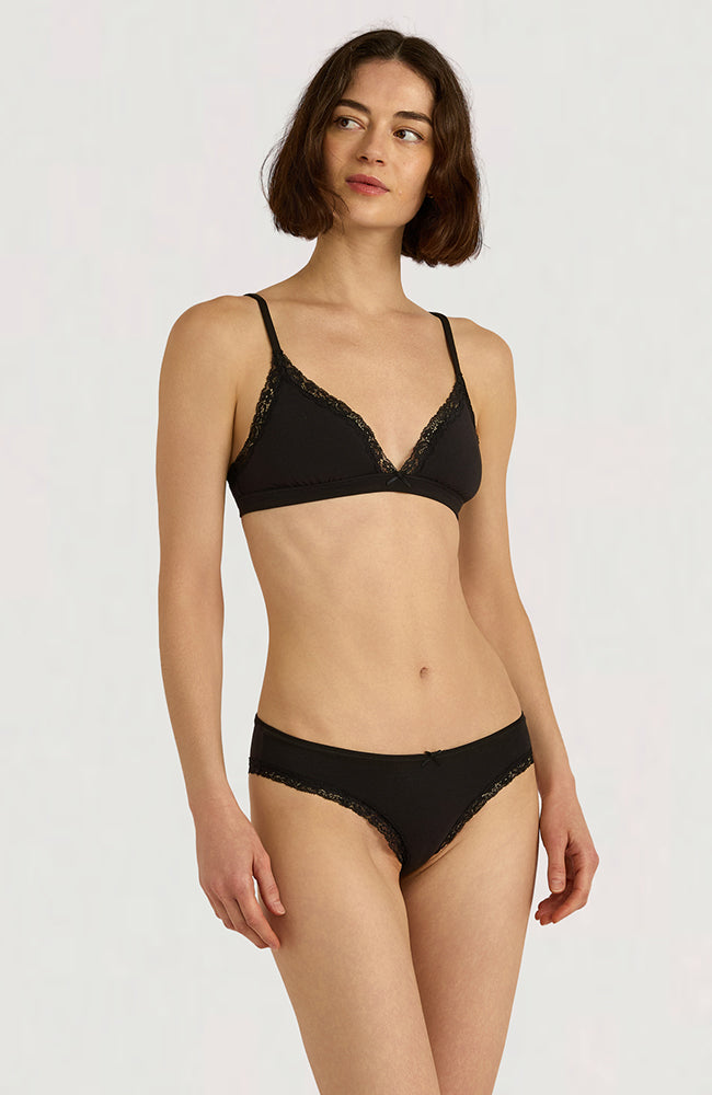 Zwarte bralette met een kantje van het merk Organic Basics. De bralette heeft verstelbare bandjes en een pull-on model (geen sluiting). Ze is gemaakt van biologisch katoen met een beetje elastan.