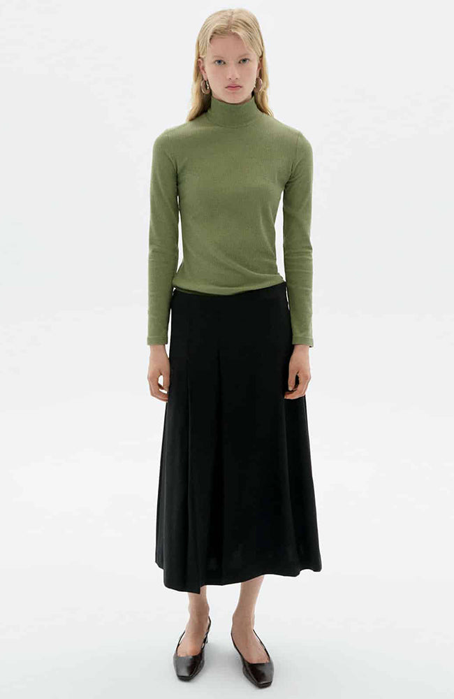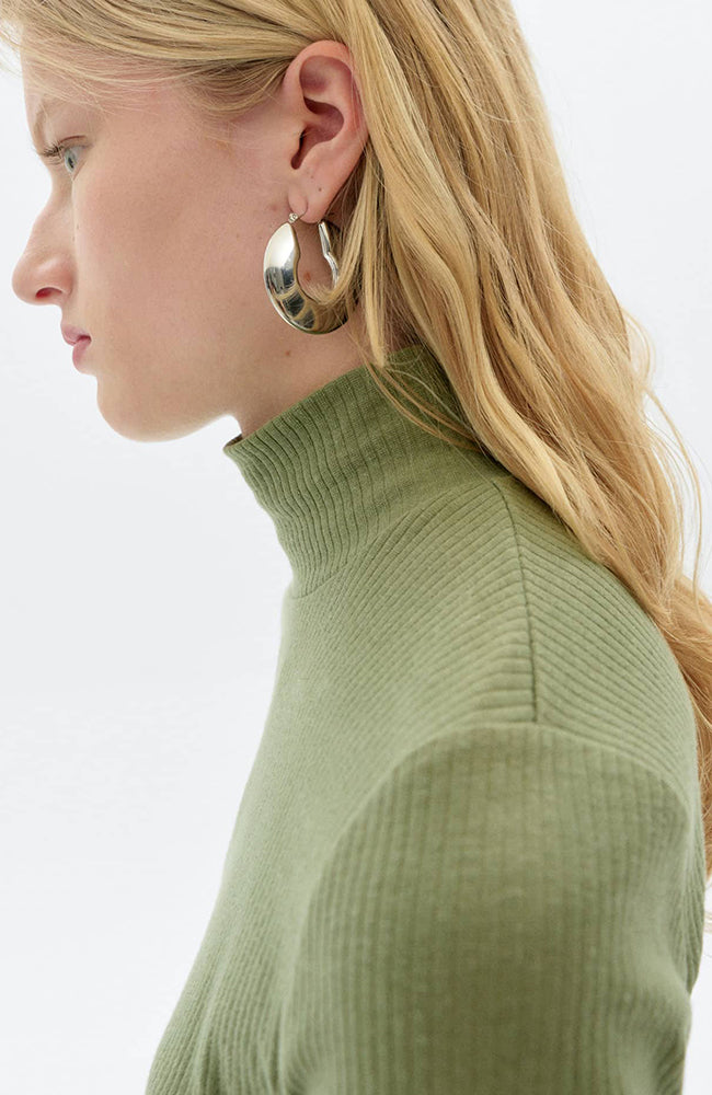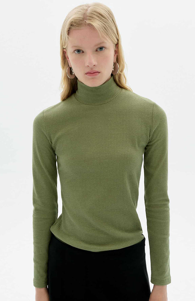 Groene coltrui met lange mouwen van het Spaanse merk Thinking MU. Deze top heeft een verticale rib en een kleine col rond de hals. Ze is gemaakt van een zachte en soepele bio katoen X hennep mix.