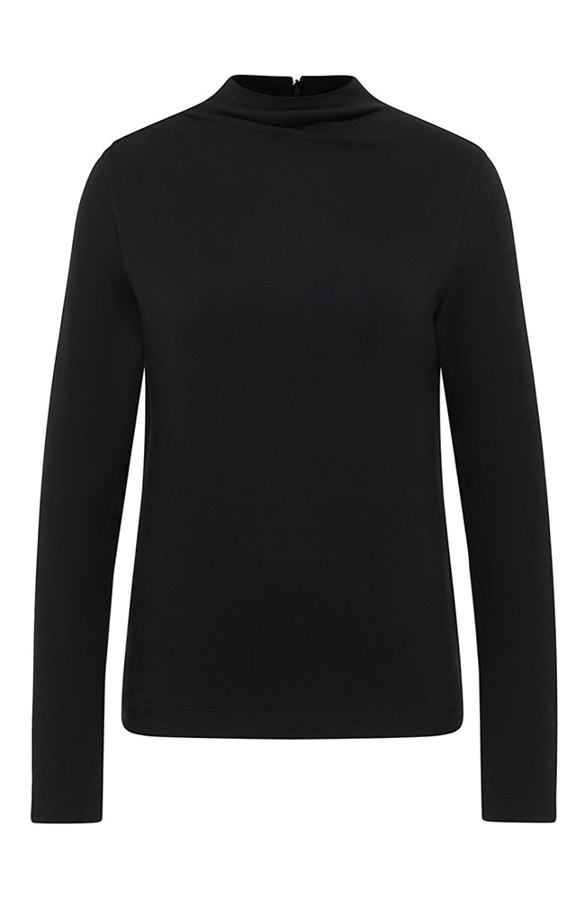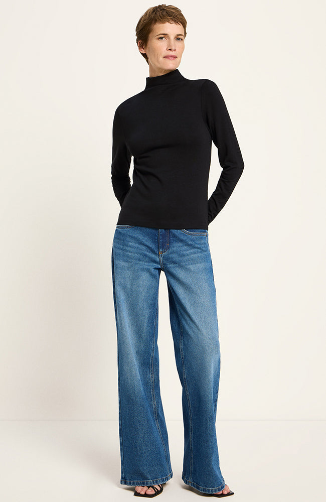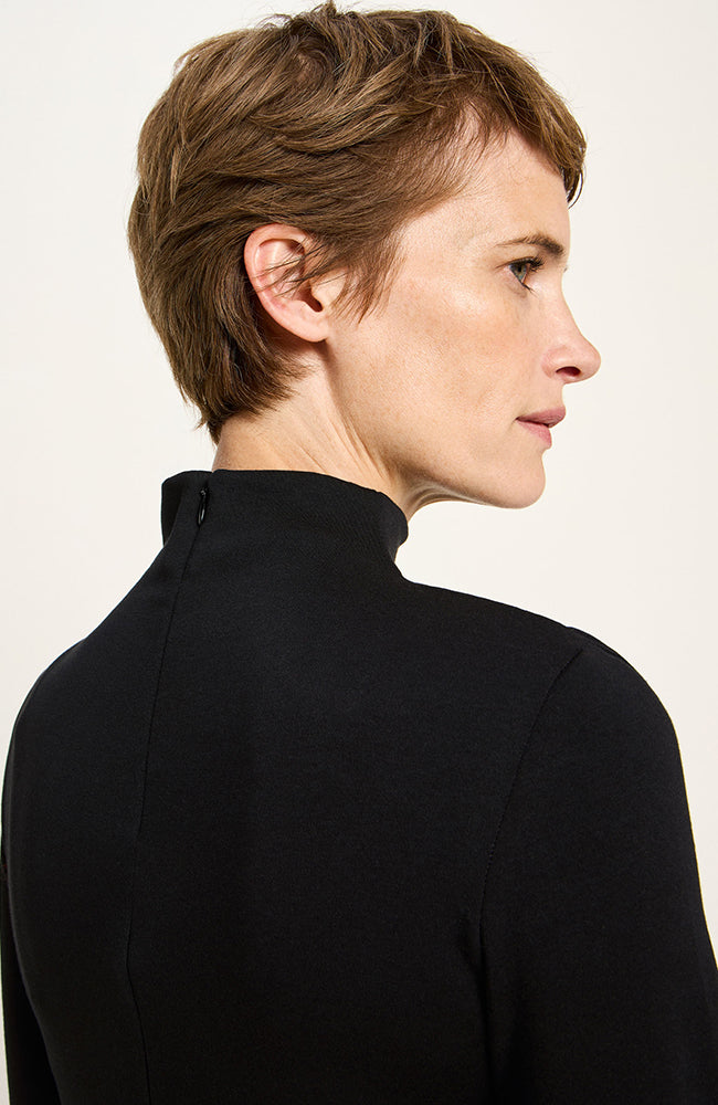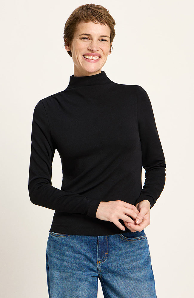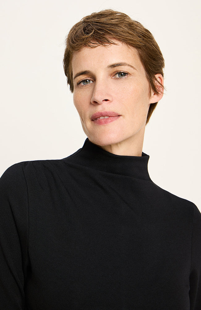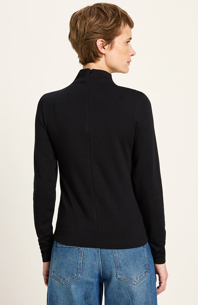 Fijne zwart coltrui van het Duitse merk LANIUS. Het model heeft een rol col, lange mouwen en een ritje aan de achterkant. Ze is gemaakt van een mix van biologisch katoen en lyocell TENCEL.