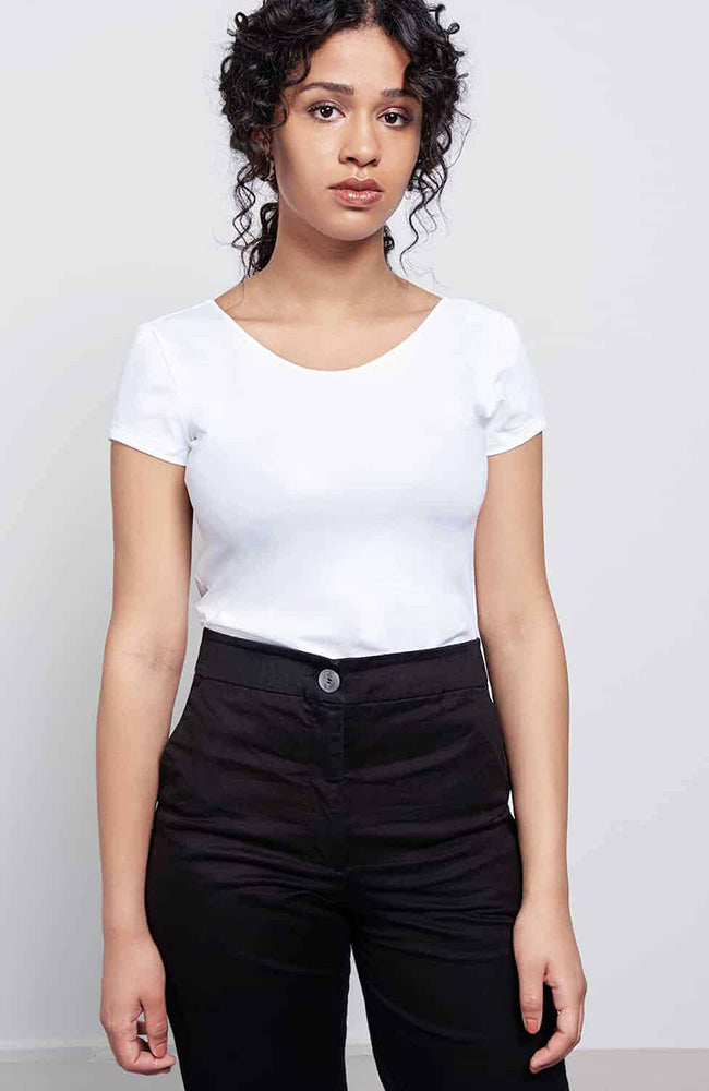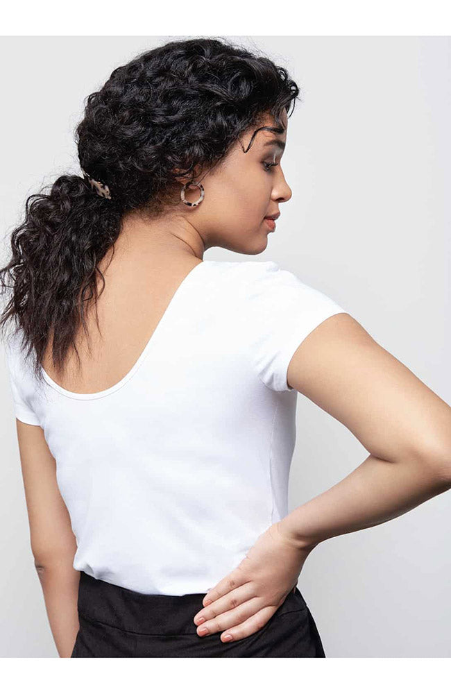Mooi basic wit shirt van Jan 'n June dat door haar vrouwelijke model nét even anders is. Gemaakt van zacht jersey biologisch katoen met een kort mouwtje, ronde halslijn en lagere ronde ruglijn (net zoals een balletpakje). Het model is aangesloten.