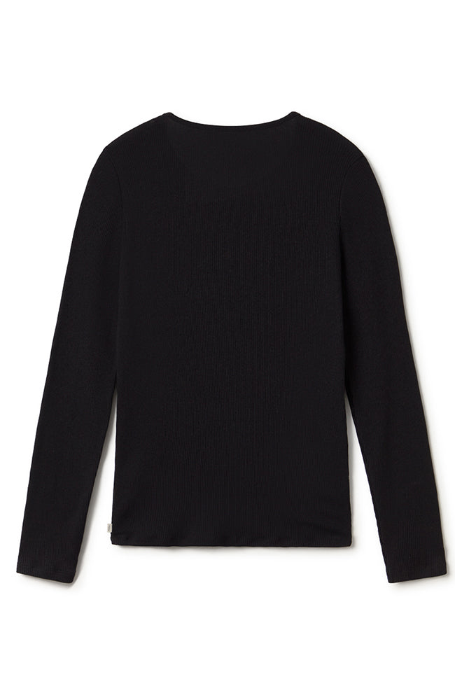 Mooie basic long sleeve van het Spaanse merk TWOTHIRDS in zwart. De dunne ribstof en de aangesloten fit zorgen voor een afgeklede look. Tevens een perfect shirt om ergens onder te dragen. Ze is gemaakt van gerecyclede materialen.