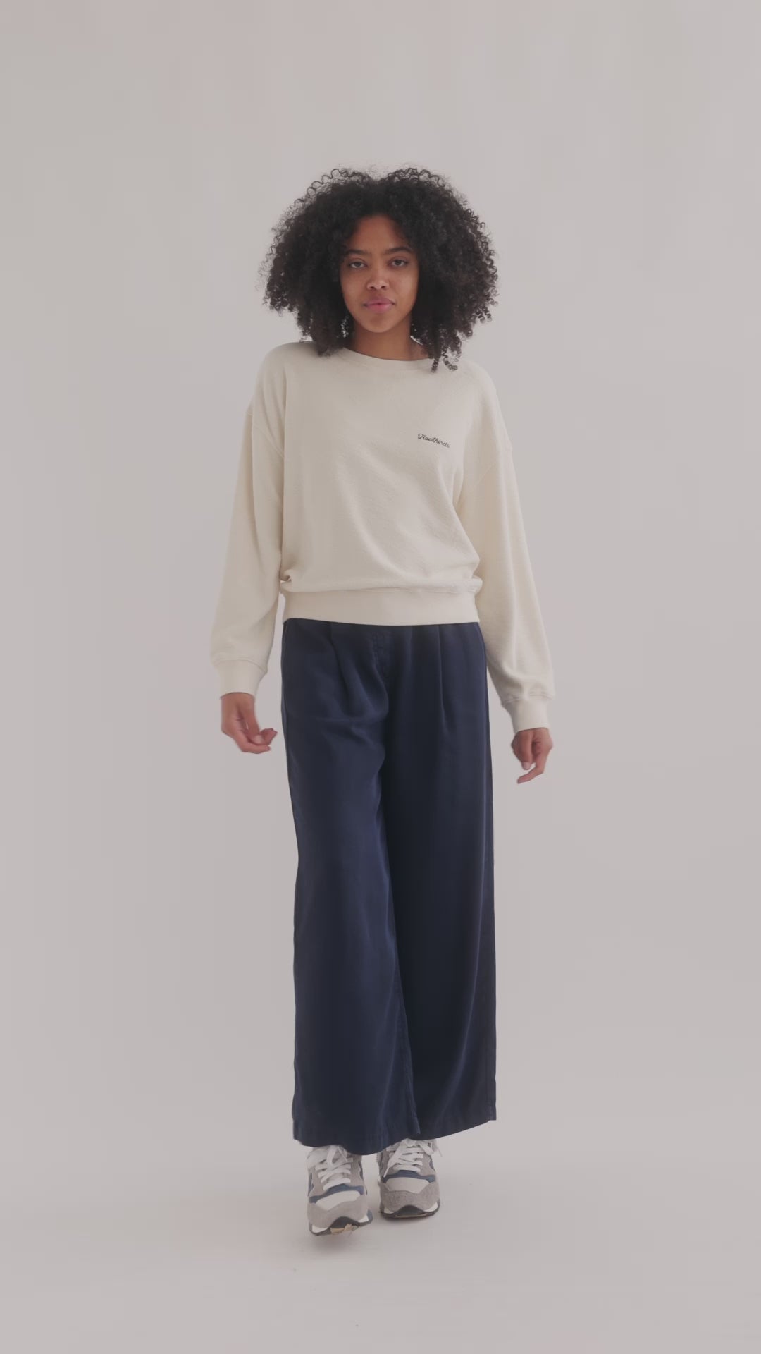 Leuke terry sweater van het Spaanse merk TWOTHIRDS in een mooie ecru kleur. Het model heeft een klassieke boord, een relaxed fit, afhangende schouders en een geborduurd TWOTHIRDS logootje op de borst. Op de achterkant is speels de tekst 'We are ocean' geborduurd. Ze is gemaakt van zacht biologisch katoen. Het model op de foto is 1.73m lang en draagt maat S.