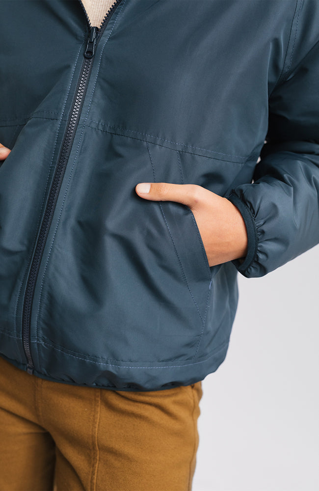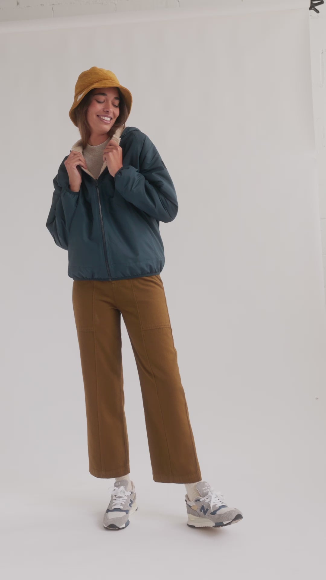 Prachtige met (nep)bont (sherpa) gevoerde winterjas van het Spaanse merk TWOTHIRDS. Dit leuke jack kan aan twee kanten gedragen worden, de teddy kant of de blauwe kant. Het model heeft raglan (schuin ingezette) mouwen, 2 steekzakken op de voorkant (aan beide kanten) en een binnenzak. De jas is helemaal gemaakt van 1 soort gerecycled materiaal, heeft een waterafstotende finish en is 100% vegan.