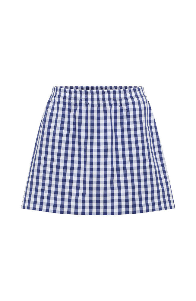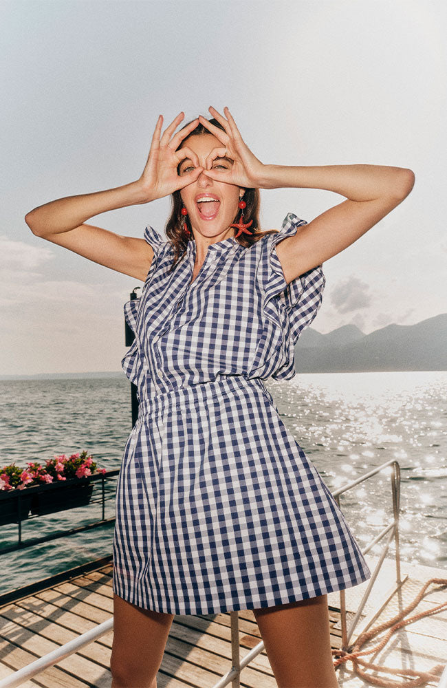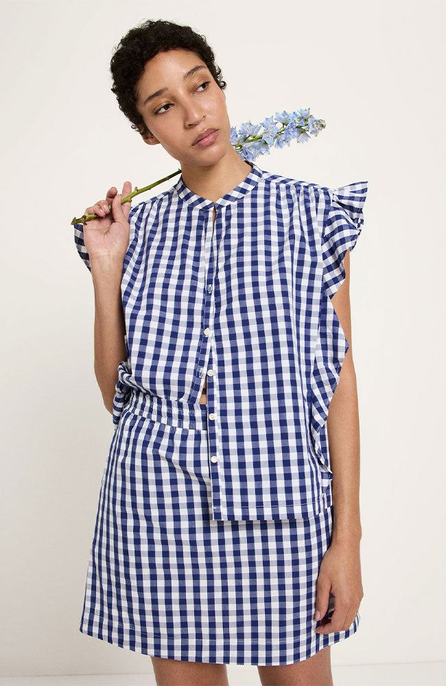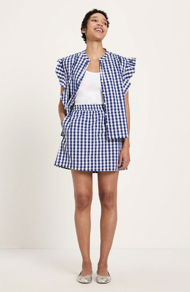Vrolijke, korte rok met een vichy ruit print in het blauw en wit van het merk Lanius. Het model heeft een elegante korte lengte, A-lijn pasvorm, zakken en is gemaakt van het 100% GOTS biologisch katoen. Zowel leuk om met de bijpassende blouse te dragen, als met bijvoorbeeld een casual spijkerjasje.