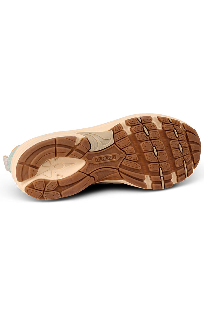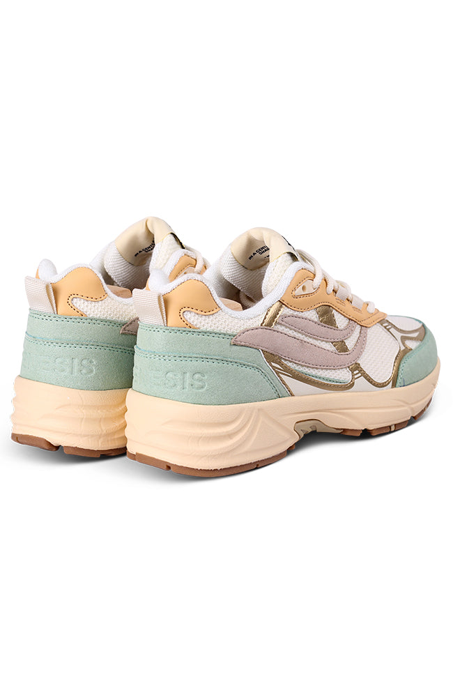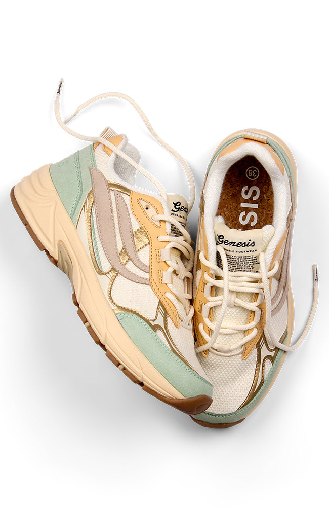 Deze prachtige vegan sneakers zijn van ons nieuwe duurzamere sneakermerk Genesis Footwear! De sneakers hebben een 'running' model en zijn gemaakt van een combinatie van maïsafval (voor het vegan leer), suikerriet (vegan suede), gerecyclede PET-flessen (veters), gerecycled PU-schuim + FSC kurk (binnenzool), duurzamer verbouwd rubber (zool) en REWAVE™ bamboe (voering). Oftewel allemaal vegan en duurzamere materialen. Deze variant van het G-Eco metallic serial model heeft mintgroene, metallic goud & zandkleurige accenten. Ze lopen heerlijk comfortabel door de dikke zool en het luchtige mess aan de buitenkant.
