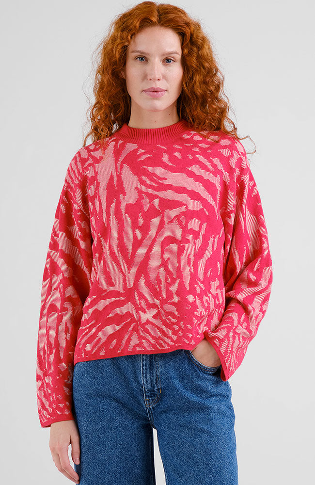 Mooie jaquard gebreide trui van Dedicated gemaakt van zacht en duurzaam biologisch katoen. De trui heeft een opvallende fuchsia/rode en zachtroze animal print. Ze heeft een wijde fit, geribde boord bij de hals en lange mouwen die iets wijder eindigen.