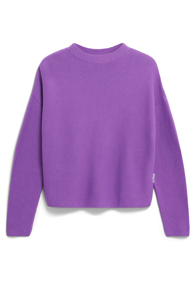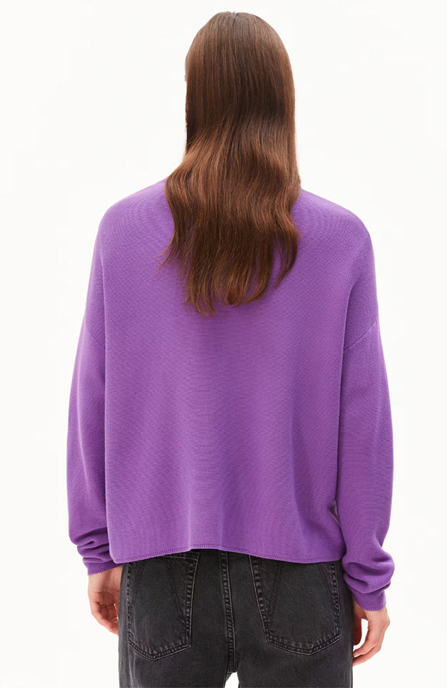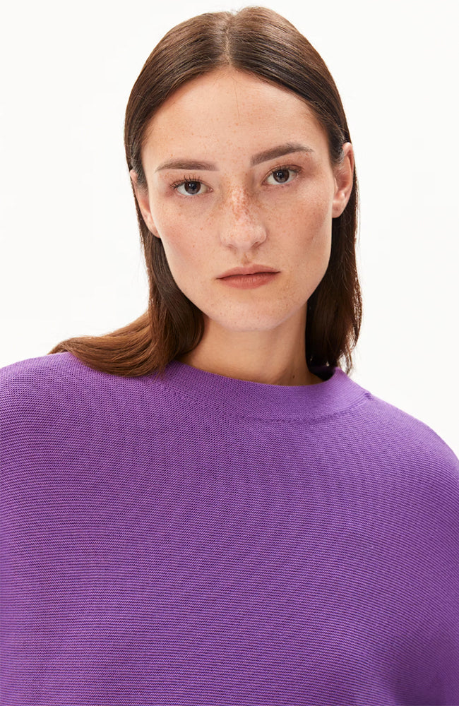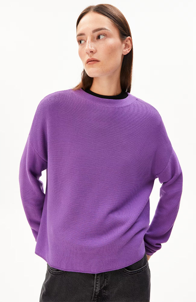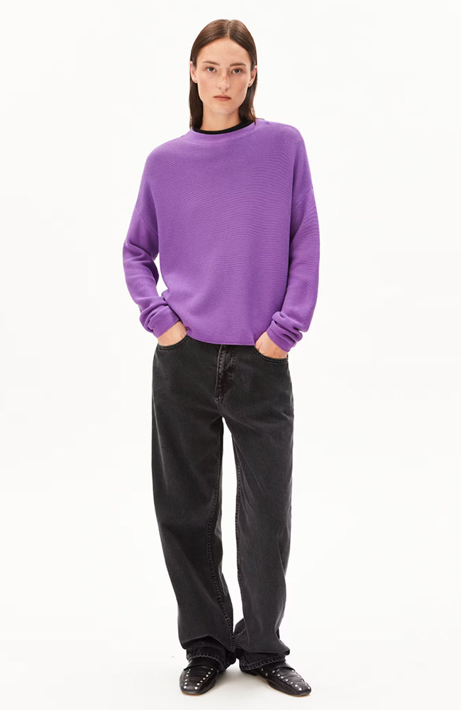 Mooie trui van ARMEDANGELS in een nieuwe paarse 'orchid' kleur. Deze trui heeft een klein opstaand randje en een afhangende schoudernaad. De trui is gemaakt van een dikkere kwaliteit biologisch katoen.