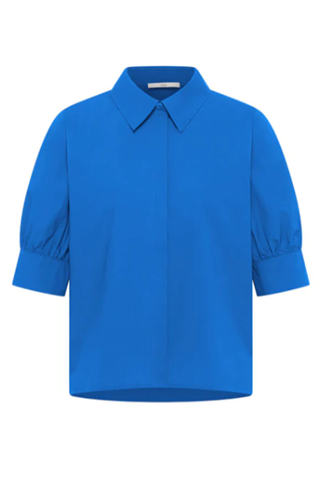 Mooie, nette blouse in een diep blauwe kleur lapis van het merk LANIUS. De blouse heeft een kraagje, driekwart pofmouwen en knoopjes van boven tot onder. Ze is gemaakt van GOTS biologisch katoen.