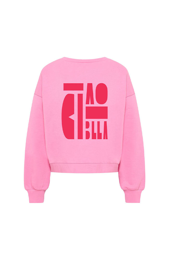 Vrolijke roze sweater met een ciao bella tekst aan de voor- en achterkant in het rood van LANIUS. De trui heeft lange mouwen, een ronde hals en boxy fit. Ze is gemaakt van 100% GOTS gecertificeerd biologisch katoen.
