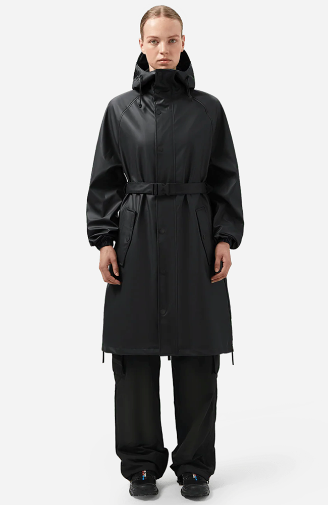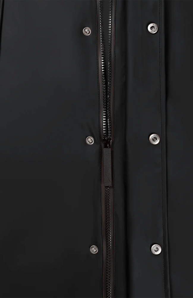 - Tweezijdige waterafstotende ritssluiting aan voorzijde voorzien van overslag met drukknopen