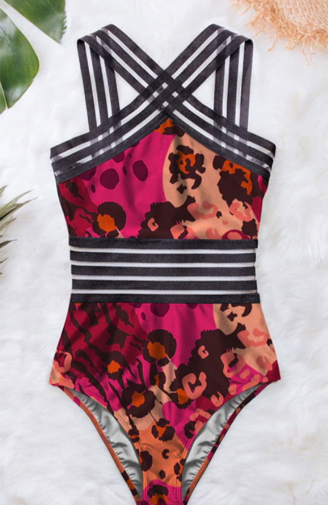 Dit prachtige Alanis badpak van AAVA met roze, bruin, witte abstracte animal print. Het heeft twee gekruiste doorzichtig/zwarte banden aan de voorkant die over de rug recht naar beneden lopen. Eenzelfde band legt het accent op de taille. Het badpak is zo ontwikkeld dat de elastische band en de gekruiste schouderbanden i.c.m. het stevige materiaal genoeg ondersteuning geven aan de buste (er zitten geen cups in dit badpak), ook voor grote borsten tot en met cup G. Het badpak is gemaakt van duurzaam ECONYL. Het ademt, zit comfortabel en is super zacht en stretchy. De kleur is het beste te zien op de 2e foto.