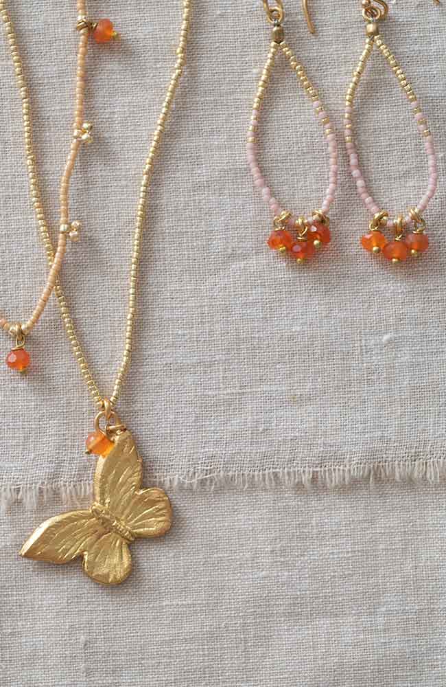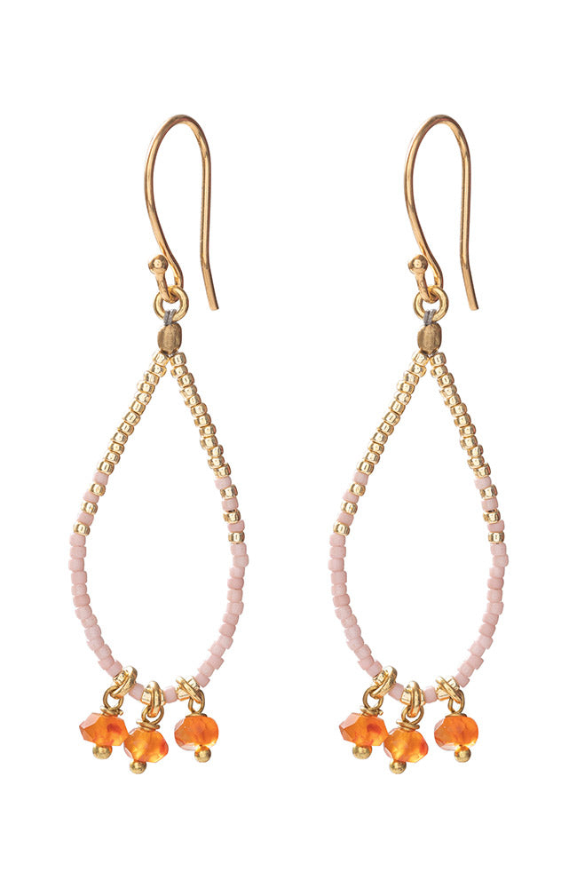 Prachtige hangers van A Beautiful Story. De oorbel bestaat uit een combinatie van glaskralen, messing kralen en kleine carneool edelsteentjes. De carneool edelsteen staat voor moed, creativiteit en verandering.