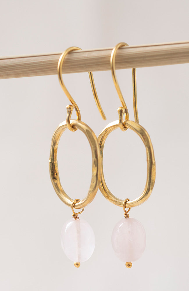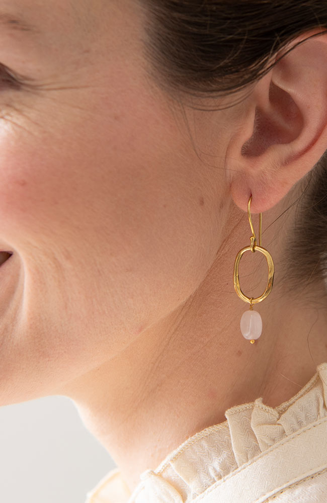 Deze goudkleurige oorbellen (6 cm) van A Beautiful Story hebben een ovaalvormige ring met een licht roze rose quartz (rozenkwarts) steentje als hanger. De rozenkwarts steen staat voor liefde, harmonie en behulpzaamheid.