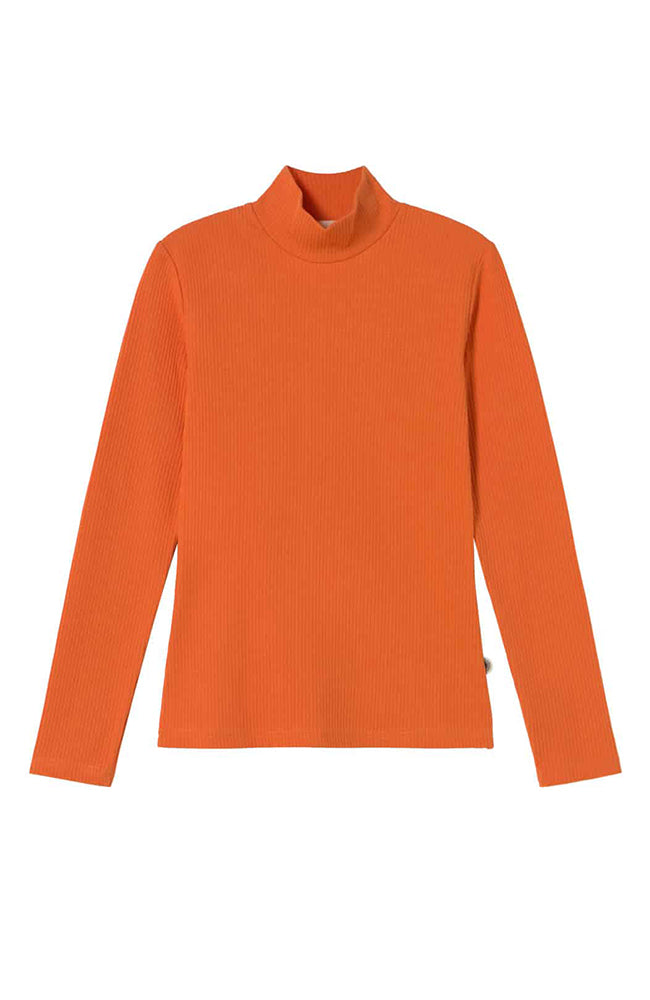 Oranje coltrui met lange mouwen van het Spaanse merk Thinking MU. Deze top heeft een verticale rib en een kleine col rond de hals. Ze is gemaakt van een zachte en soepele bio katoen X hennep mix.