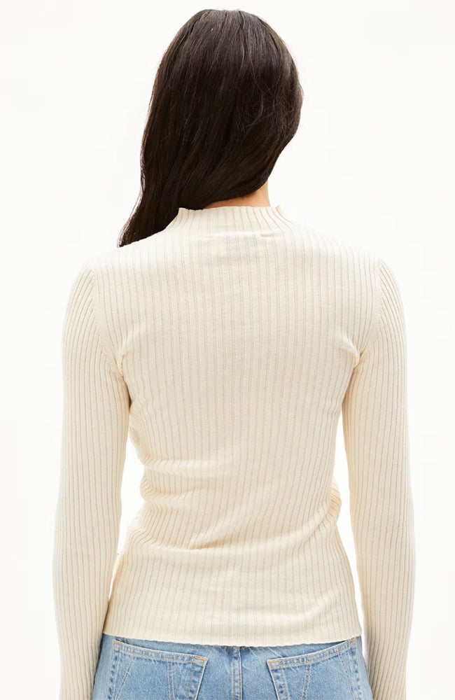 Leuke coltrui in een mooie oatmilk/gebroken witte kleur van ARMEDANGELS, gemaakt van zacht biologisch katoen. Het welbekende model van de Alaania heeft een geschubde lage col, verticale rib en een aangesloten fit.