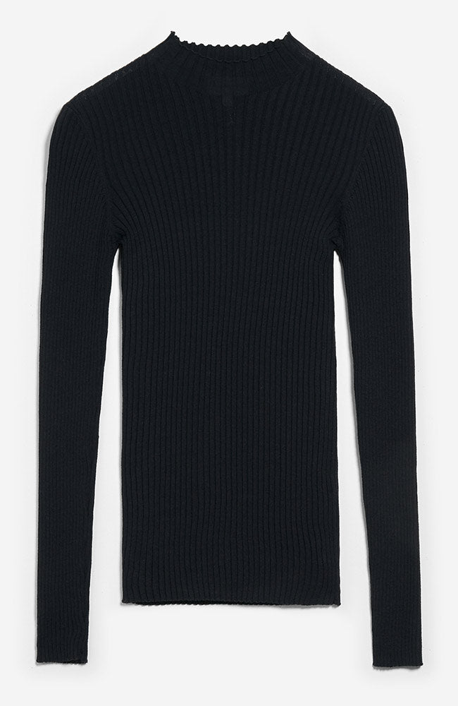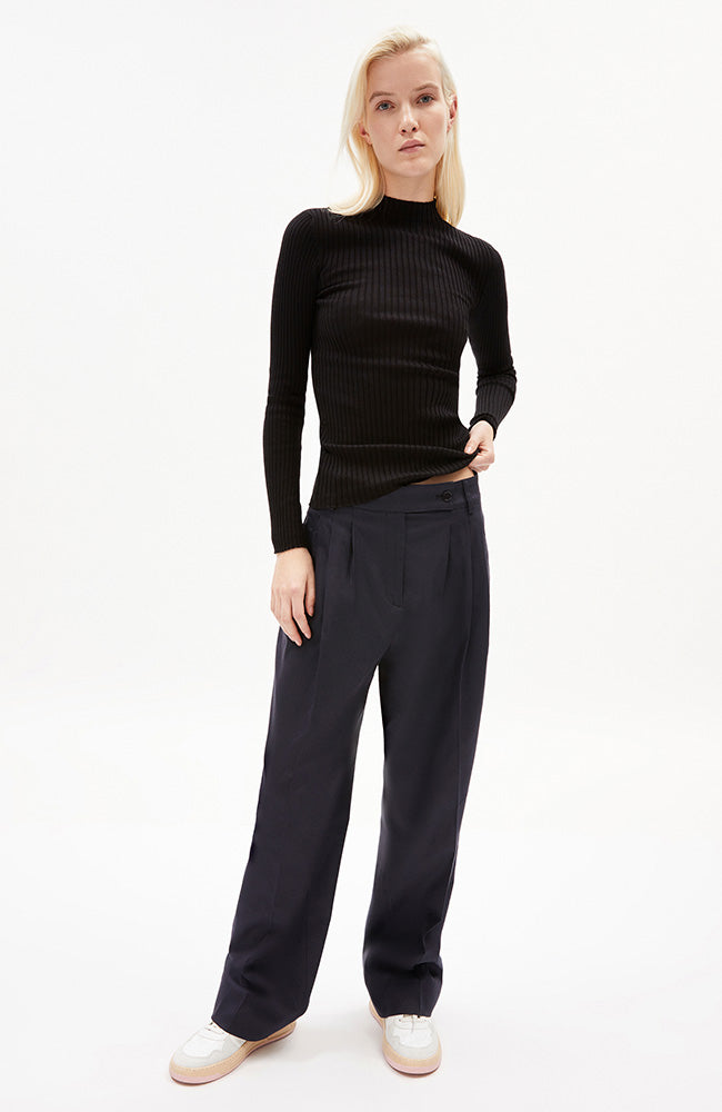 1 van de bestsellers van ARMEDANGELS is deze leuke coltrui in zwart gemaakt van zacht biologisch katoen. Het welbekende model van de Alaani heeft een geschubde lage col, verticale rib en een aangesloten fit.