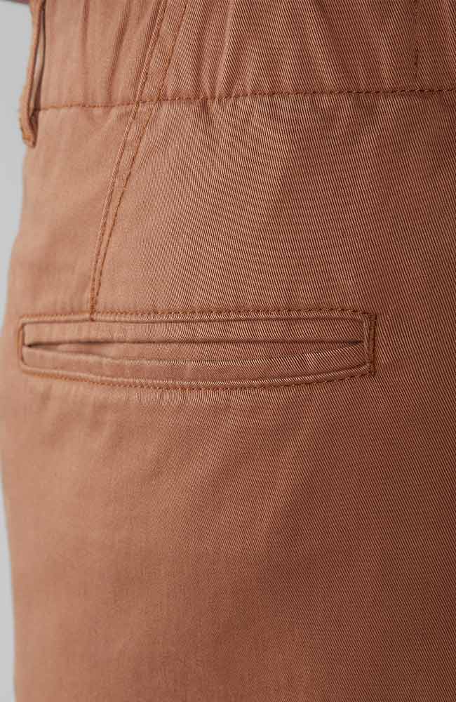 Chino met een normale fit en recht pijpen in een bruine (woodsmoke) van Dedicated. Het model heeft wat stretch en elastiek in de band aan de achterkant, waardoor hij extra comfortabel zit.