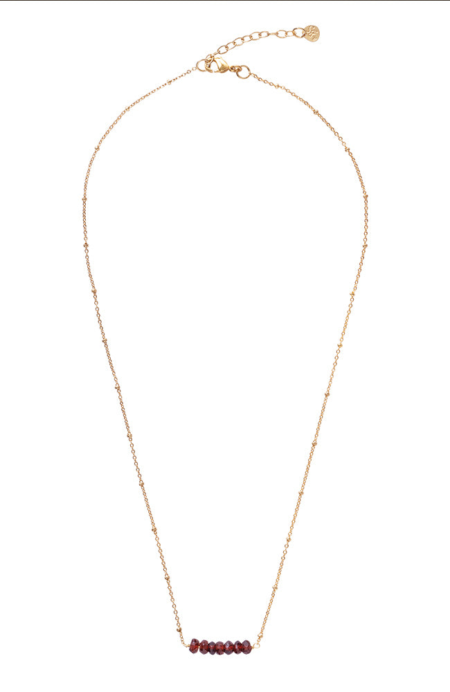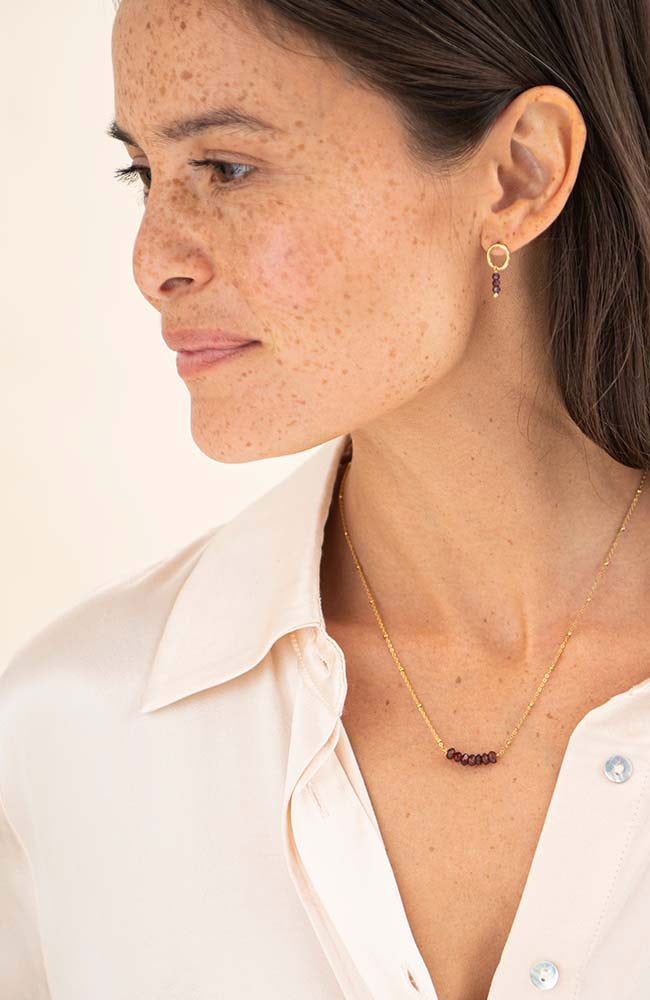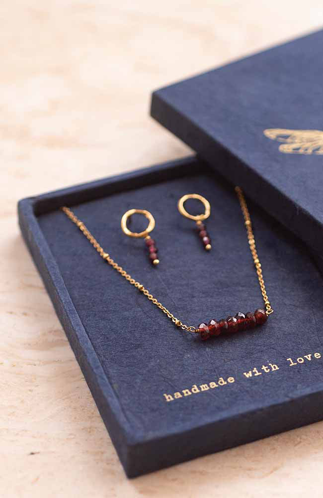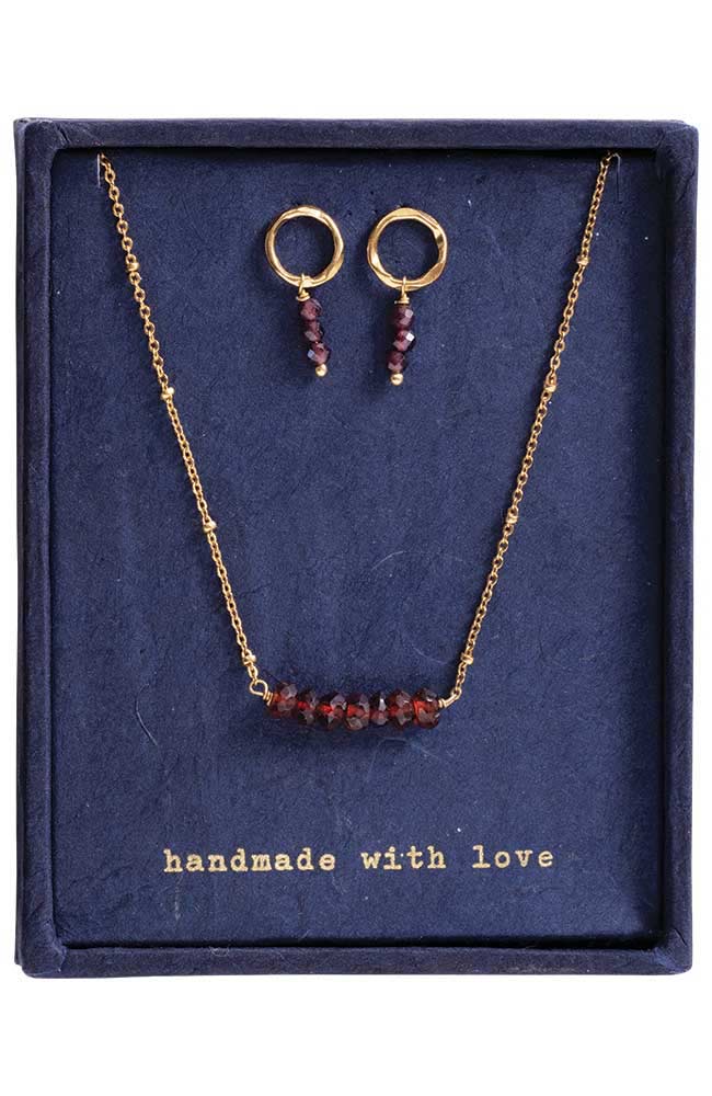 Nieuw van A Beautiful Story dit seizoen zijn de giftsets! Een prachtige set bestaande uit mooie oorhangers en een kettinkje. Deze set heeft een aantal rode granaat edelsteentjes aan zowel de oorbellen als het hangertje van de ketting. Granaat is glanzend, intens en puur. Ben je jezelf even kwijt? Granaat heeft energie genoeg. Je vindt de weg weer naar jezelf, je eigen drijfveren en je passie.