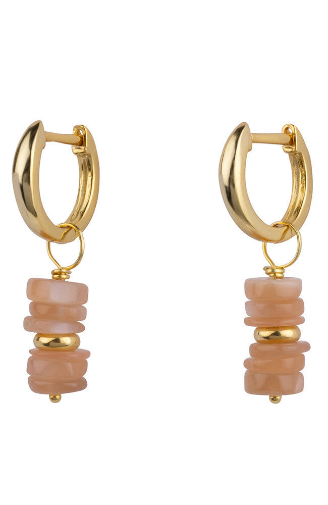 Goudkleurige oorhangertjes met steentjes in een 'peach moonstone' kleur van het Nederlandse merk Jules Bean. Maat: doorsnee oorring 11 mm, lengte hanger 20 mm en sluit met klaphaakje.