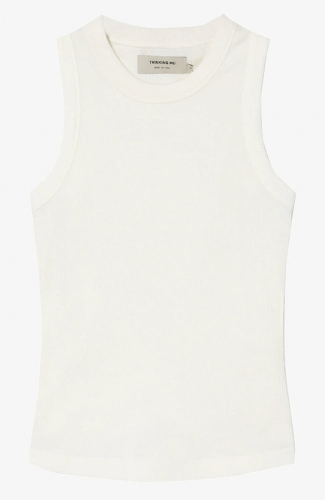 Witte mouwloze tanktop met hoge halslijn van Thinking Mu. Het model is aangesloten, heeft een verticale rib en is gemaakt van zacht een duurzaam biologisch katoen.