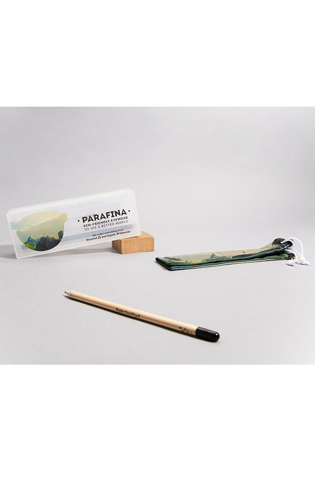 De bril is verpakt in een doosje met een gerecycled microfiber doekje en een potlood waar zaadjes in zitten om te planten.