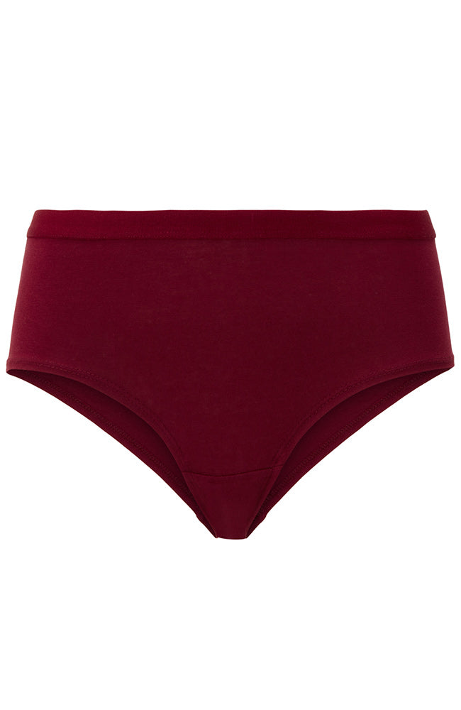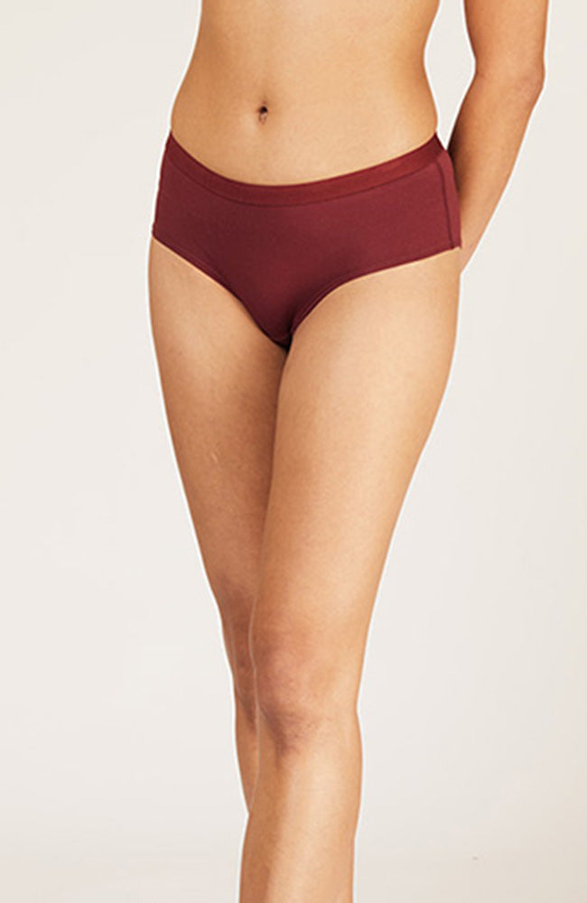Rode (burgundy) biologische (low rise) onderbroek van People Tree. Deze onderbroek is gemaakt van extra zacht en ademend biologisch katoen en heeft een comfortabele elastische taille.