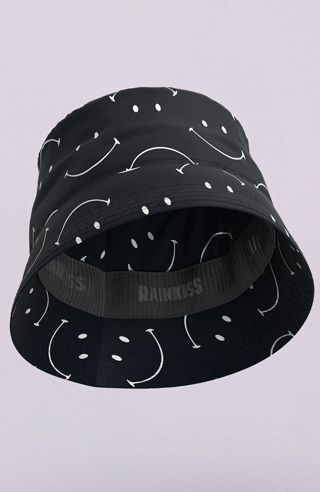 Deze hippe Smiley regenhoed is van het Amsterdamse merk Rainkiss. Dit hoedje heeft getapte naden, is 100% waterdicht met een waterkolom van 7K mm.