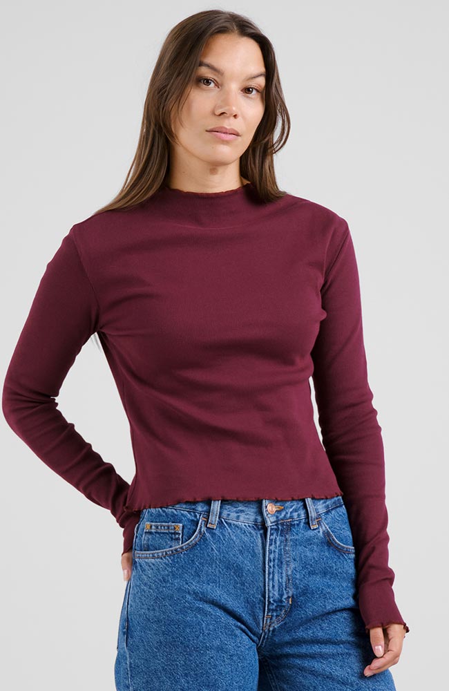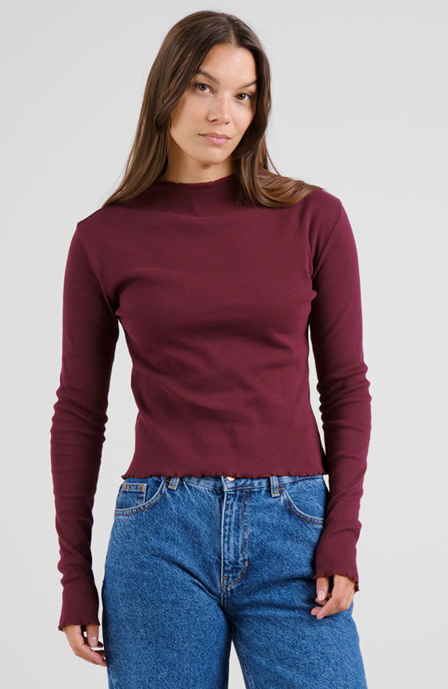 Mooie aangesloten rib long sleeve top van Dedicated. De top heeft een wat hogere, geschubde ronde hals en heeft ook geschubde randjes langs de mouwen en aan de onderkant. De warm bordeaux rode kleur maakt deze kwalitatieve basic toch opvallend. De top is gemaakt van duurzaam biologisch rib katoen & met een beetje elastan er door zodat ze mooi aangesloten is. Het model op de foto is 1.75m en draagt maat S.