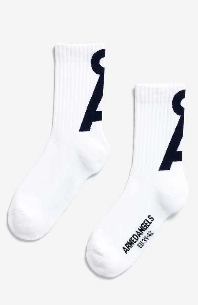 De geliefde Saamus sportsokken van ARMEDANGELS zijn er nu ook in een wat kortere variant: de Saamus SHORT. Deze zachte sportsokken hebben een grote letter A (het logo van ARMEDANGELS) op de achterkant. Ze zijn gemaakt van zacht biologisch katoen en gaan lang mee. Deze variant is wit met een donkerblauwe A er op.