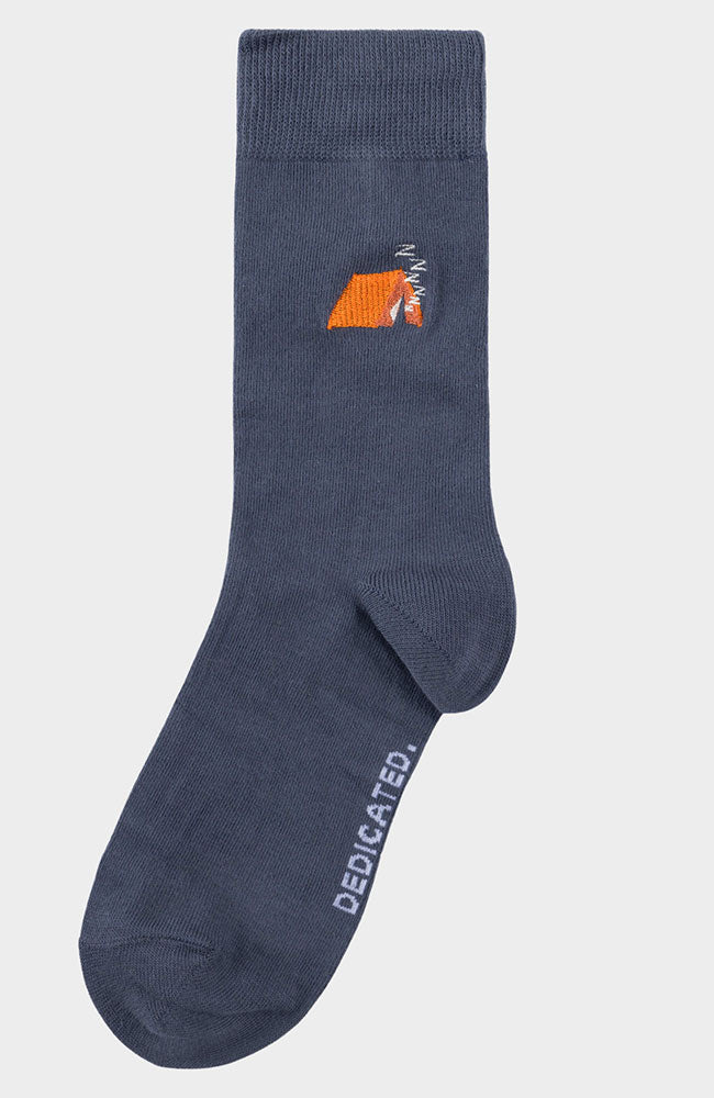 Deze sokken van Dedicated zijn blauw/grijs met een afbeelding van een tentje op de enkel. De sokken zijn gemaakt van heerlijk zacht en comfortabel biologisch katoen.