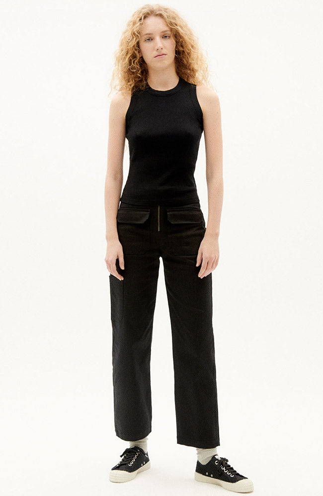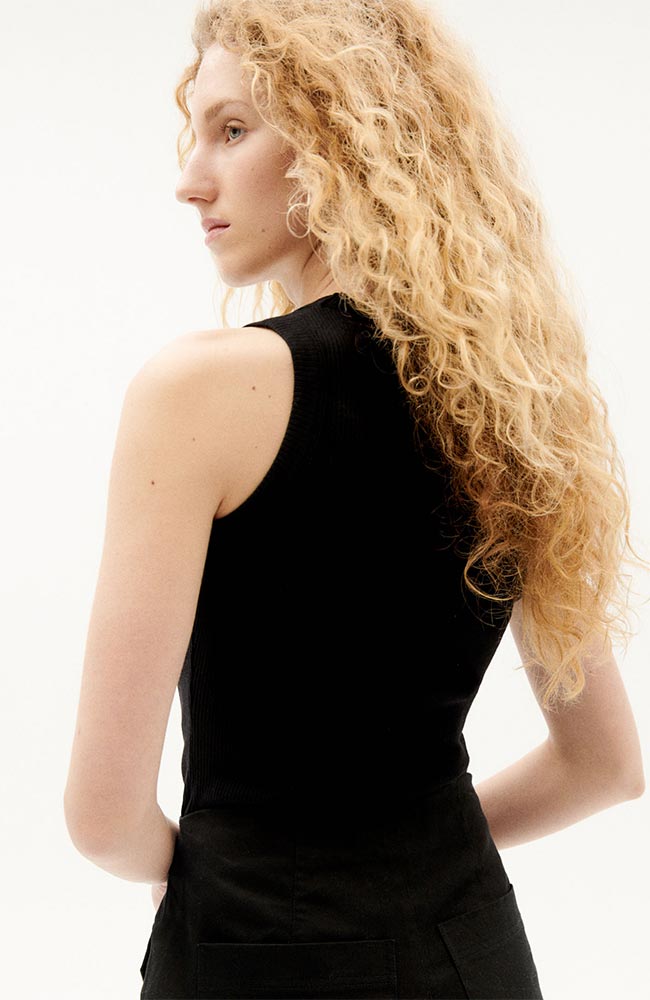 Zwarte mouwloze tanktop met hoge halslijn Thinking Mu. Het model is aangesloten, heeft een verticale rib en is gemaakt van zacht een duurzaam biologisch katoen.