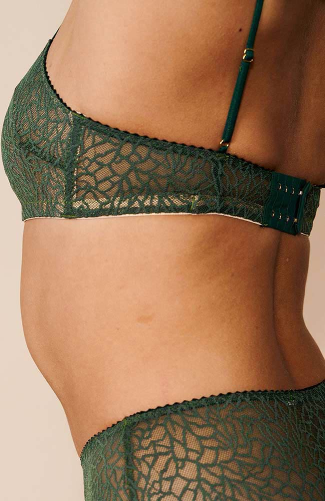 Deze Tora BH van Underprotection is gemaakt van mooi donkergroen kant met een abstract patroon er in. De BH heeft een bandeau model met bandjes en een beige mesh voering waardoor hij niet doorschijnt. Zit heerlijk comfortabel en staat mooi onder een doorschijnende top.